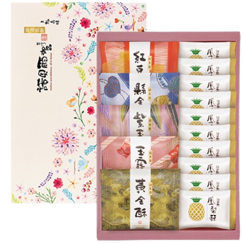 玉露Q餅、紫玉Q餅、縣金Q餅、紅豆Q餅、黃金酥各一包、鳳梨酥*10顆