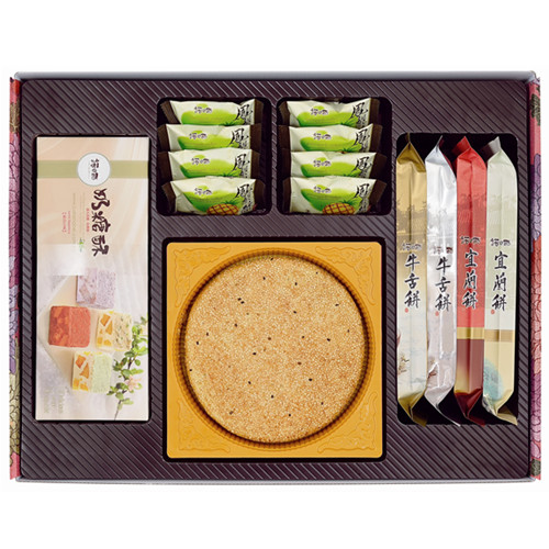 綜合奶糖酥、鳳梨酥、玉露狀元餅、軟式牛舌餅-原味、軟式牛舌餅-黑糖、宜蘭餅-楓糖、宜蘭餅-鮮奶。