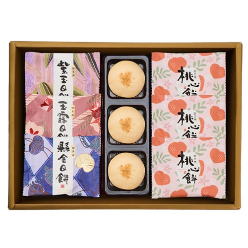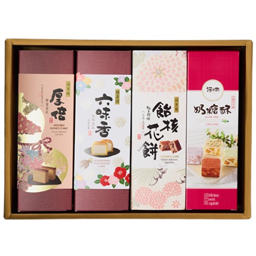 上層:紫玉Q餅、玉露Q餅、縣金Q餅、花生巧心、桃心餅。 下層:厚倍蜂蜜蛋糕、六味香起酥蛋糕、飴核花餅、綜合奶糖酥。